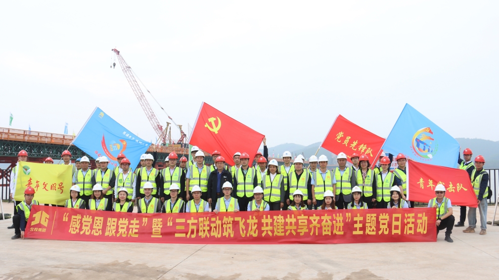 北投公路、交科、路建集團聯合開展飛龍大橋“智匯”黨建聯盟活動現場合影