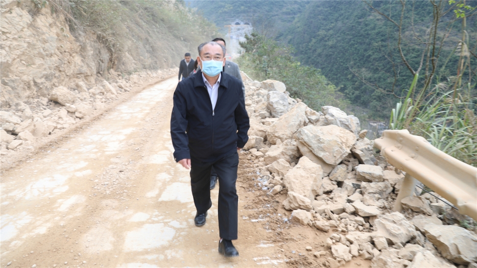 鳳山縣恰如其名,山嶺縱橫,山路蜿蜒;塌方后的山路尤為崎嶇。朱堅和、曾慶生一行冒著沙塵,步行來到鳳山縣鳳城鎮弄者村村部周邊的鄉屯,實地了解農村道路、路燈等基礎設施建設現狀。