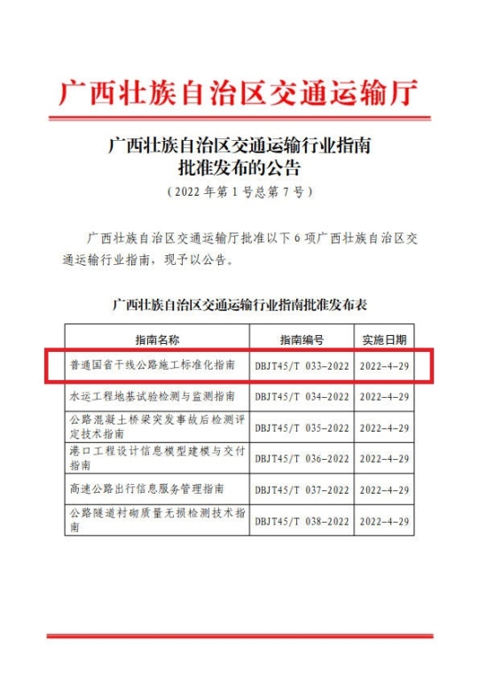 近日,北投公路集團第2部主持編制的廣西交通運輸行業指南《普通國省干線公路施工標準化指南》(DBJT45/T 033-2022)(以下簡稱《指南》)獲得自治區交通運輸廳批準發布,于2022年4月29日起實施。