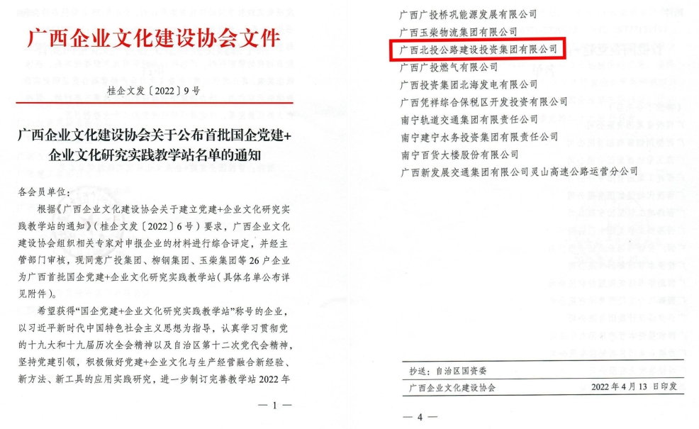 4月13日,廣西企業(yè)文化建設協會公布首批國企黨建+企業(yè)文化研究實踐教學站名單,北投公路集團成功入選。