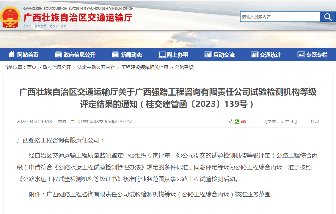 近日,自治區交通運輸廳公布了《關于廣西強路工程咨詢有限責任公司試驗檢測機構等級評定結果的通知》(桂交建管函〔2023〕139號)文件,北投公路集團直屬企業廣西強路工程咨詢有限責任公司(以下簡稱“強路公司”)順利通過評審,獲得公路工程試驗檢測綜合丙級資質,有力提升了公司市場競爭力和綜合服務水平,為接下來的業務開展提供了資質保障。
