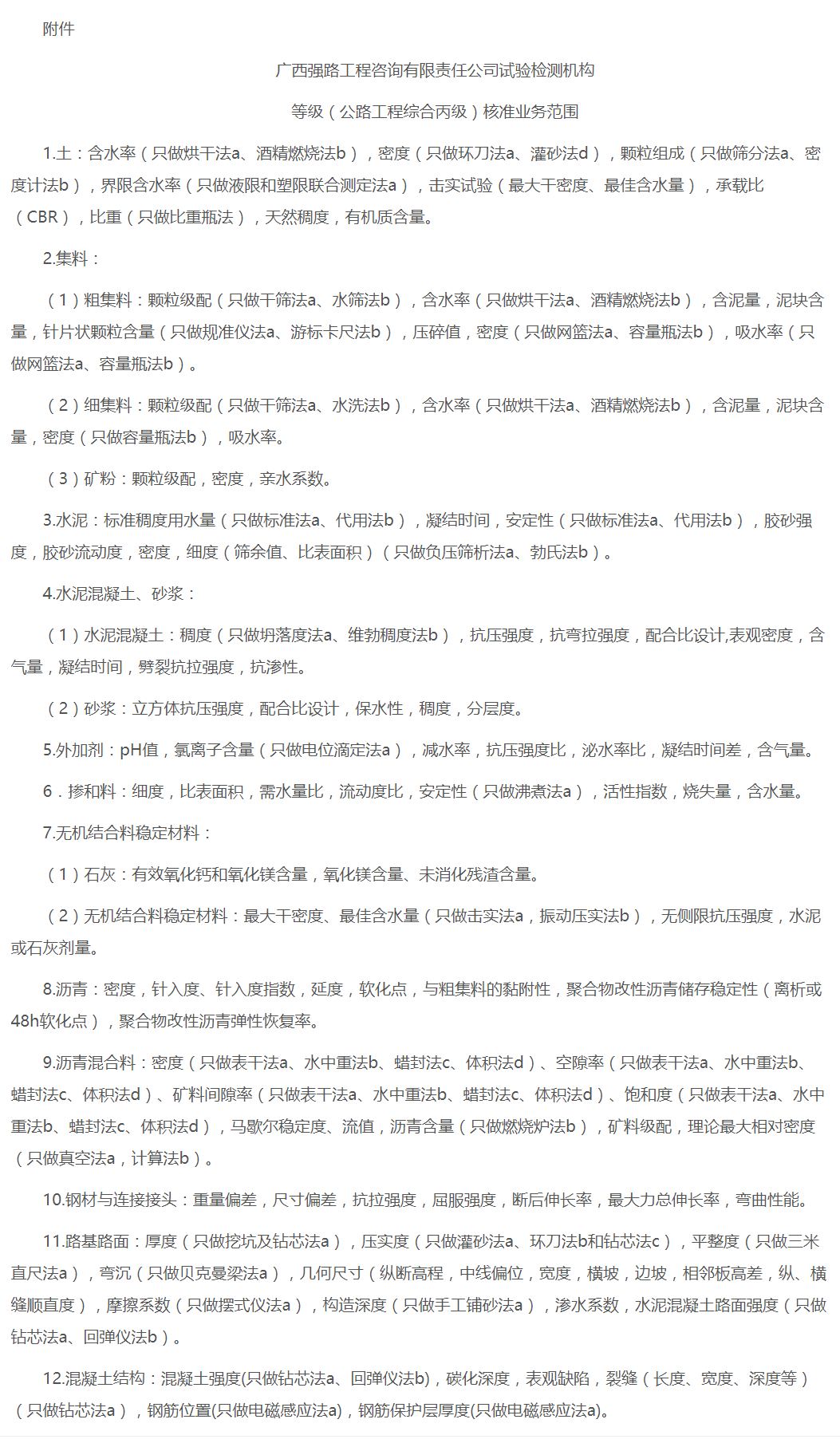強路公司在獲得公路工程綜合丙級資質后,可在土擊實試驗(最大干密度、最佳含水量)、承載比(CBR),集料、水泥的膠砂強度和膠砂流動度等公路領域核準業務范圍內從事試驗檢測活動。