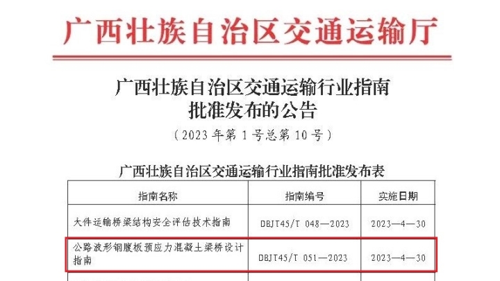 近日,由北投公路集團(tuán)牽頭編寫的廣西交通運(yùn)輸行業(yè)指南《公路波形鋼腹板預(yù)應(yīng)力混凝土梁橋設(shè)計(jì)指南》獲得廣西交通運(yùn)輸廳批準(zhǔn)發(fā)布,將于2023年4月30日實(shí)施。