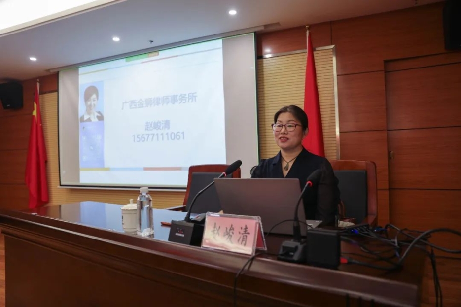 會議還邀請了廣西金獅律師事務所優秀律師趙峻清開展法制誠信主題教育講座。趙峻清律師結合案例與《合同法》《民法典》中的法律條款,深入淺出地講授了大數據背景下企業如何防范經營風險的有關知識。