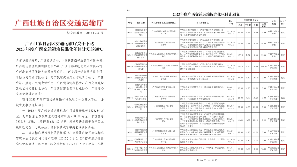 近日,廣西交通運輸廳下達(dá)2023年度廣西交通運輸標(biāo)準(zhǔn)化項目計劃,由北投公路集團主持編寫的《普通國省干線公路瀝青路面施工技術(shù)規(guī)范》《公路波形鋼腹板組合梁橋養(yǎng)護技術(shù)指南》和《國省干線公路工程風(fēng)險辨識指南》3項標(biāo)準(zhǔn)獲得批復(fù)立項。