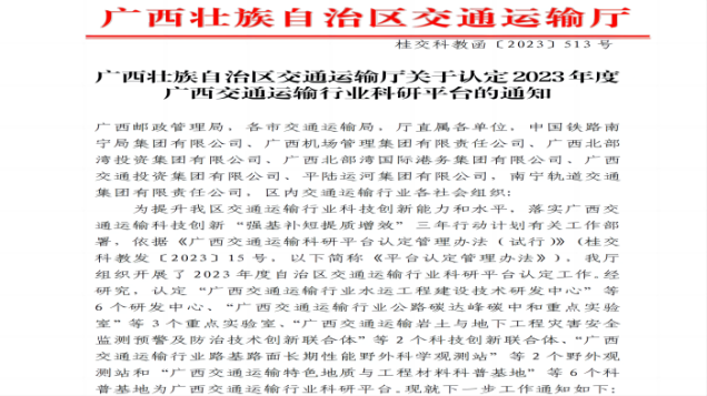 近日,廣西壯族自治區交通運輸廳發布《關于認定2023年度廣西交通運輸行業科研平臺的通知》,由集團公司牽頭組建的廣西交通運輸行業路基路面長期性能野外科學觀測站、共建的廣西交通運輸行業組合橋梁智能建造研發中心經過專家評審、現場評估順利通過認定,進一步完善了集團公司科技創新平臺體系。