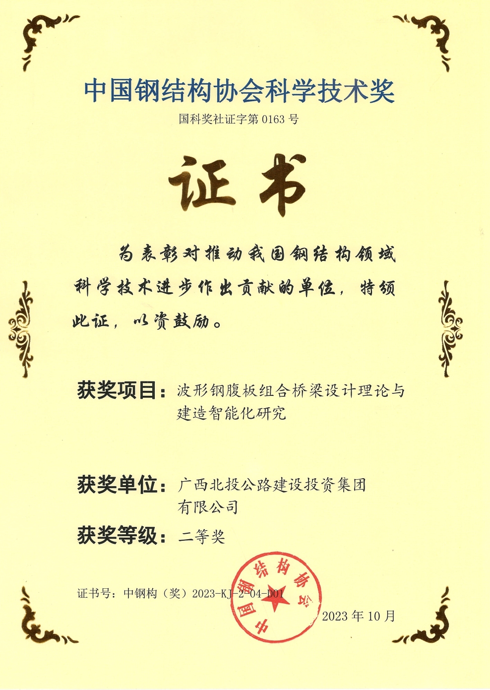 10月29日,2023中國鋼結(jié)構(gòu)大會(huì)在成都召開,會(huì)議隆重表彰了在全國鋼結(jié)構(gòu)領(lǐng)域?yàn)榭萍际聵I(yè)發(fā)展作出突出貢獻(xiàn)的科技工作者和組織,北投公路集團(tuán)主持研發(fā)的“波形鋼腹板組合橋梁設(shè)計(jì)理論與建造智能化研究”榮獲2023年度科技進(jìn)步獎(jiǎng)二等獎(jiǎng),這是集團(tuán)公司首個(gè)主持科技獎(jiǎng)項(xiàng)。