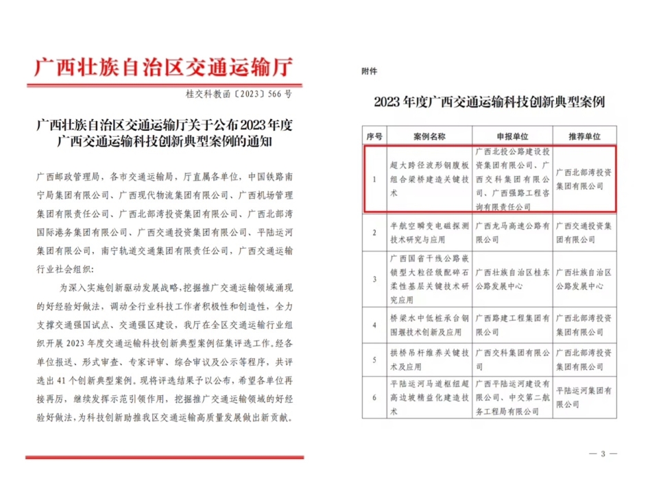 近日,自治區(qū)交通運(yùn)輸廳公布了“2023年度廣西交通運(yùn)輸科技創(chuàng)新典型案例”評(píng)選結(jié)果,北投公路集團(tuán)以“世界第一跨”飛龍大橋?yàn)閼?yīng)用示范申報(bào)的《超大跨徑波形鋼腹板組合梁橋建造關(guān)鍵技術(shù)》成功入選。這是北投公路集團(tuán)在波形鋼腹板連續(xù)剛構(gòu)橋領(lǐng)域取得的又一亮眼成就,也是公司加強(qiáng)科技創(chuàng)新、加快轉(zhuǎn)型升級(jí)、鉚足發(fā)展后勁的重要體現(xiàn)。