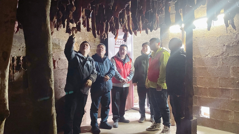 圖為黃凌志(左2)在弄者村臘肉臘腸加工廠調(diào)研