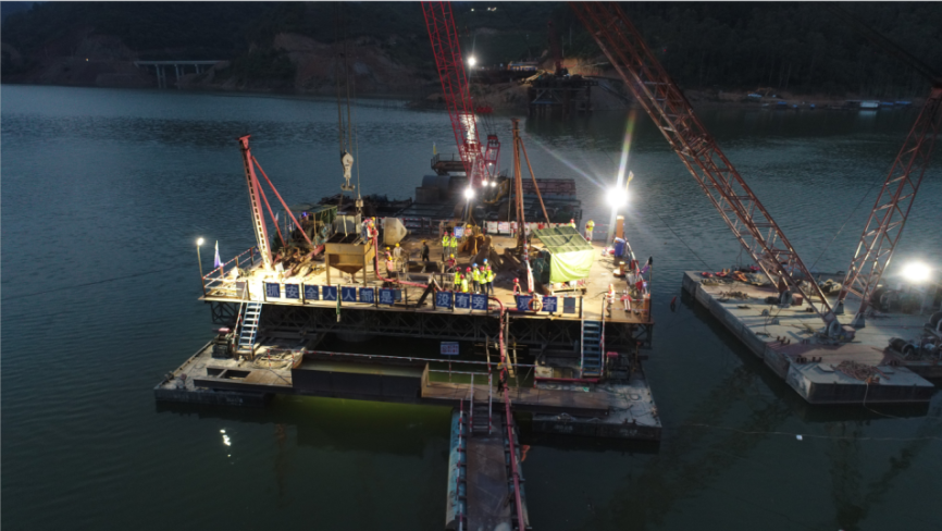 施工前,北投公路集團(tuán)要求施工單位做足充分準(zhǔn)備,對浮吊、履帶吊、泵車、拖泵、混凝土運(yùn)輸車等設(shè)備提前檢修,備齊石子、砂、水泥等原材料,科學(xué)合理調(diào)配各類資源;制定安全與環(huán)保方面管理措施,確保施工安全與環(huán)保;制定應(yīng)急方案,確保灌注過程中,混凝土順利送達(dá),保障施工順利進(jìn)行。