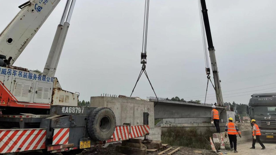 東風中橋位于桂林市靈川縣莊屋村附近,橋梁中心里程為K8+579,橋長20米,需架設3片預制箱梁。東風中橋橋梁長度長,與產梁的預制梁場距離約13公里,運距較遠,且運梁道路部分利用舊路交通不便。針對這些問題,建設辦精心安排,增加3臺運梁車、2臺130噸吊車吊裝和運輸箱梁,并派維修人員進行全程跟蹤,為運梁車正常運行提供保障,在各參建人員的共同努力下,東風中橋僅用一天就完成了全部箱梁架設任務。(通訊員:莫光龍、周遠/文 項目部/圖)