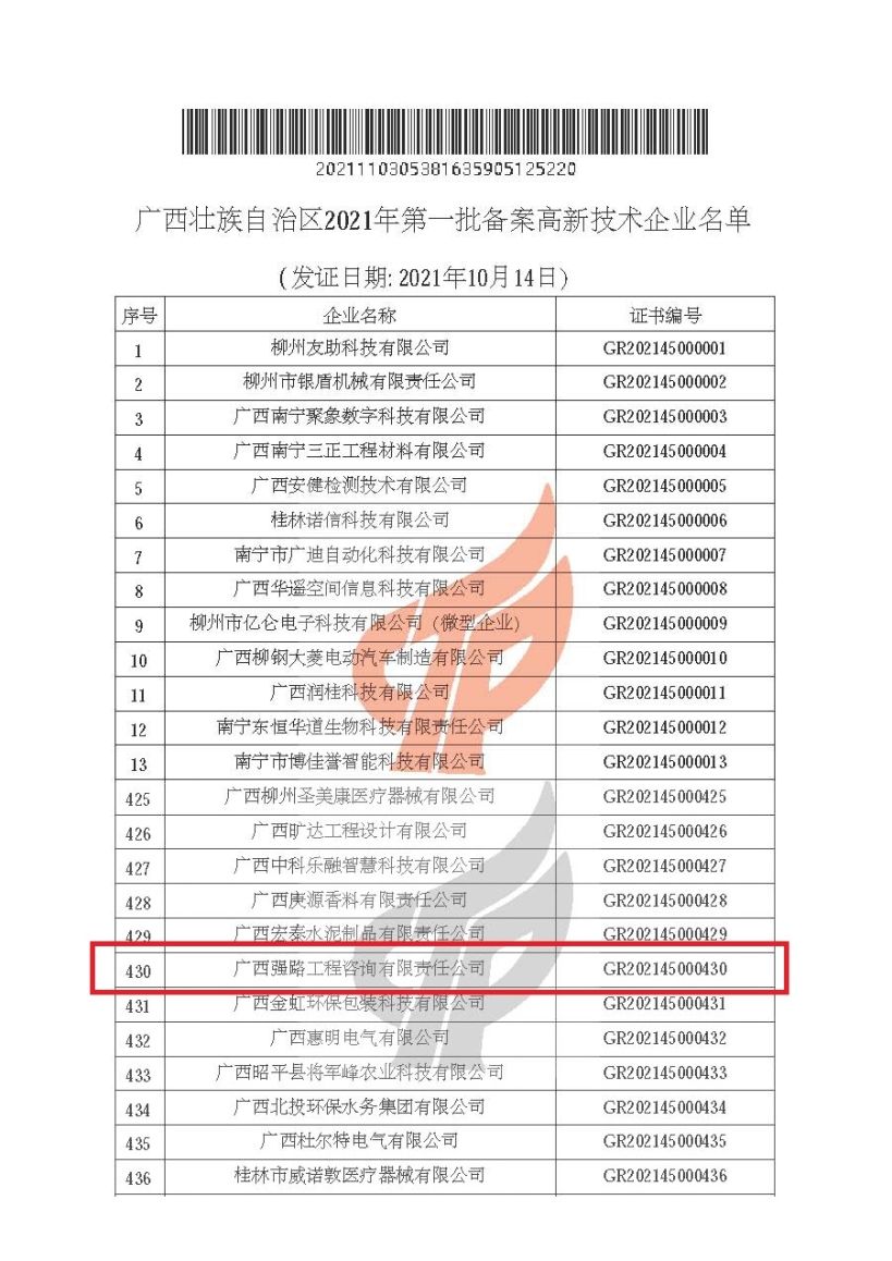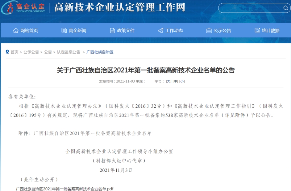 近日,高新技術企業(yè)認定管理工作網(wǎng)公布了廣西壯族自治區(qū)2021年第一批備案的538家高新技術企業(yè)名單,北投公路集團直屬企業(yè)廣西強路工程咨詢有限責任公司名列其中。
