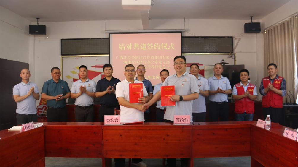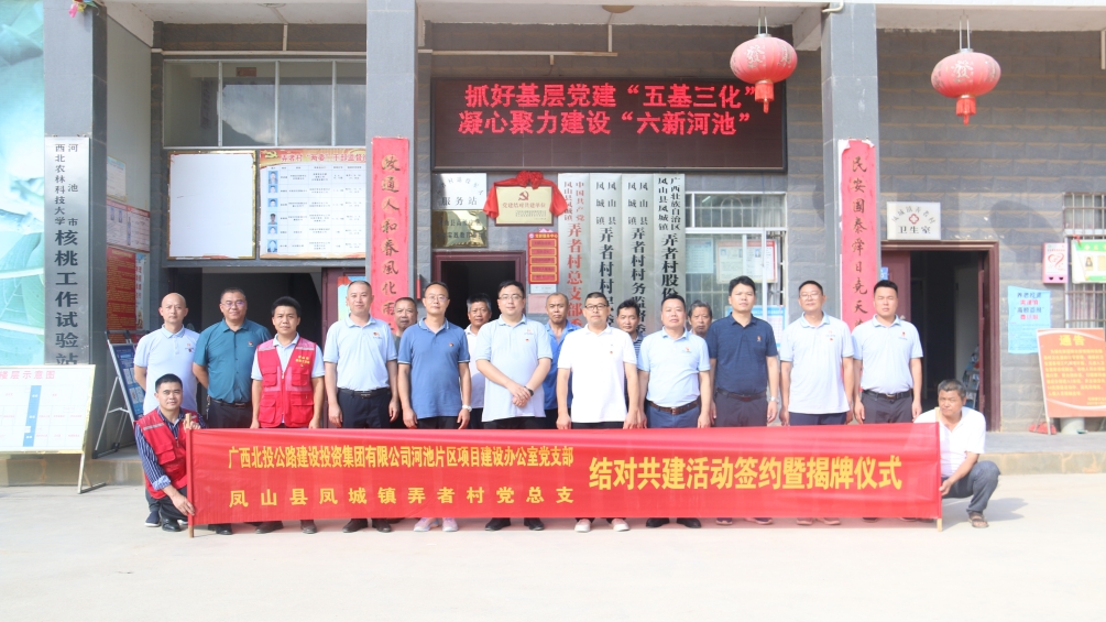 為進一步落實基層黨建“五基三化”攻堅年行動方案,提高駐村幫扶工作實效,搭建黨建引領鄉村振興的平臺,7月12日,北投公路集團河池片區項目黨支部與公司結對幫扶村黨支部鳳山縣弄者村黨支部舉行黨建共建簽約暨揭牌儀式。鳳山縣縣委常委、副縣長王志平,集團公司黨委副書記、董事、工會主席周強出席活動。