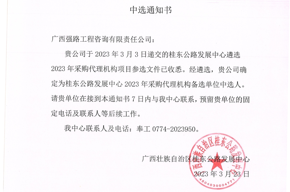 3月23日,北投公路集團直屬企業(yè)強路公司順利通過桂東公路發(fā)展中心審批,入選該中心2023年度采購代理機構庫。