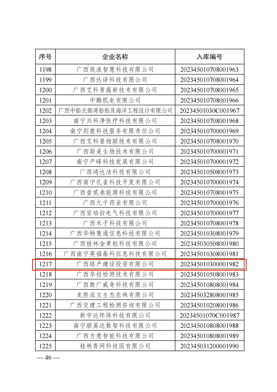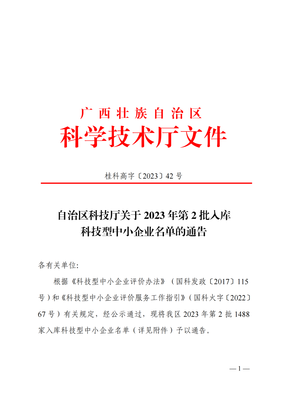 近日,廣西壯族自治區科學技術廳印發了《自治區科技廳關于2023年第2批入庫科技型中小企業名單的通告》(桂科高字〔2023〕42 號)文件,確定北投公路集團直屬企業廣西路產建設投資有限公司順利通過2023年“科技型中小企業”的認定。