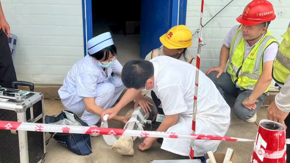 演練模擬強降雨致拌合站駐地面臨洪水威脅、工人撤離受傷場景。現場施工員發現險情后,迅速匯報并啟動應急預案,現場警戒組、搶險救援組、醫療救護組、物資保障組、交通疏導組聞令而動,立即開展警戒隔離、傷員救治、物資轉移、交通疏導等工作。待醫護人員抵達現場后,聯合完成傷員轉運。同時,演練還包含骨折、溺水急救知識培訓環節。